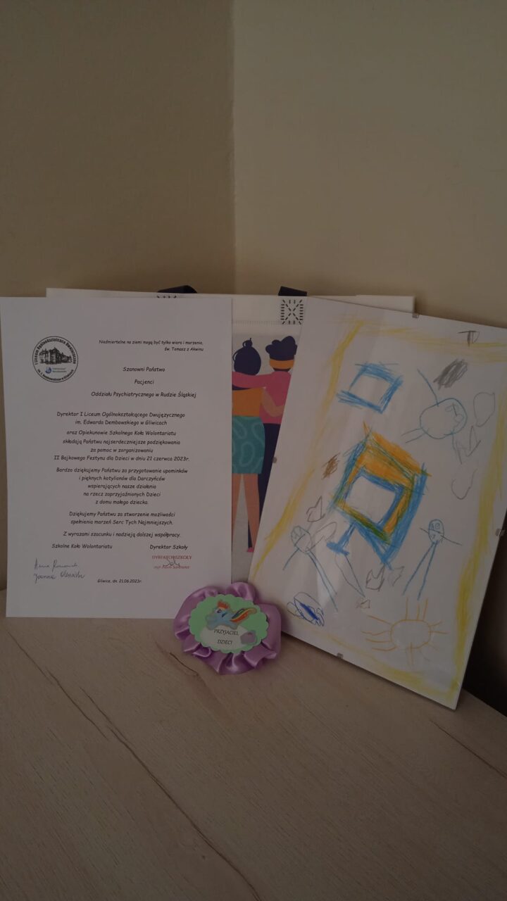 Z wielką przyjemnością pragniemy podzielić się z Państwem informacją, że nasi Pacjenci z Oddziału Psychiatrycznego Ogólnego oraz nasza terapeutka, pani Karolina Wypior, niedawno wspomogli organizację II Bajkowego Festynu dla Dzieci w Gliwicach. Otrzymali oni przepiękne podziękowania od Dyrektora I Liceum Ogólnokształcącego Dwujęzycznego im. Edwarda Dembowskiego w Gliwicach oraz od Opiekunów Szkolnego Koła Wolontariatu.