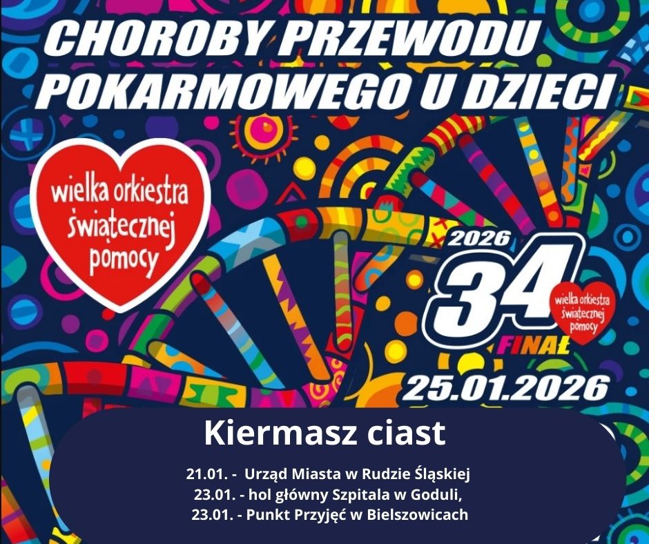 Po raz kolejny Szpital Miejski w Rudzie Śląskiej włącza się w akcję na rzecz Wielkiej Orkiestry Świętej Pomocy. W naszej placówce oraz Urzędzie Miasta Ruda Śląska organizujemy kiermasz ciast, z którego dochód w całości zostanie przeznaczony na WOŚP.