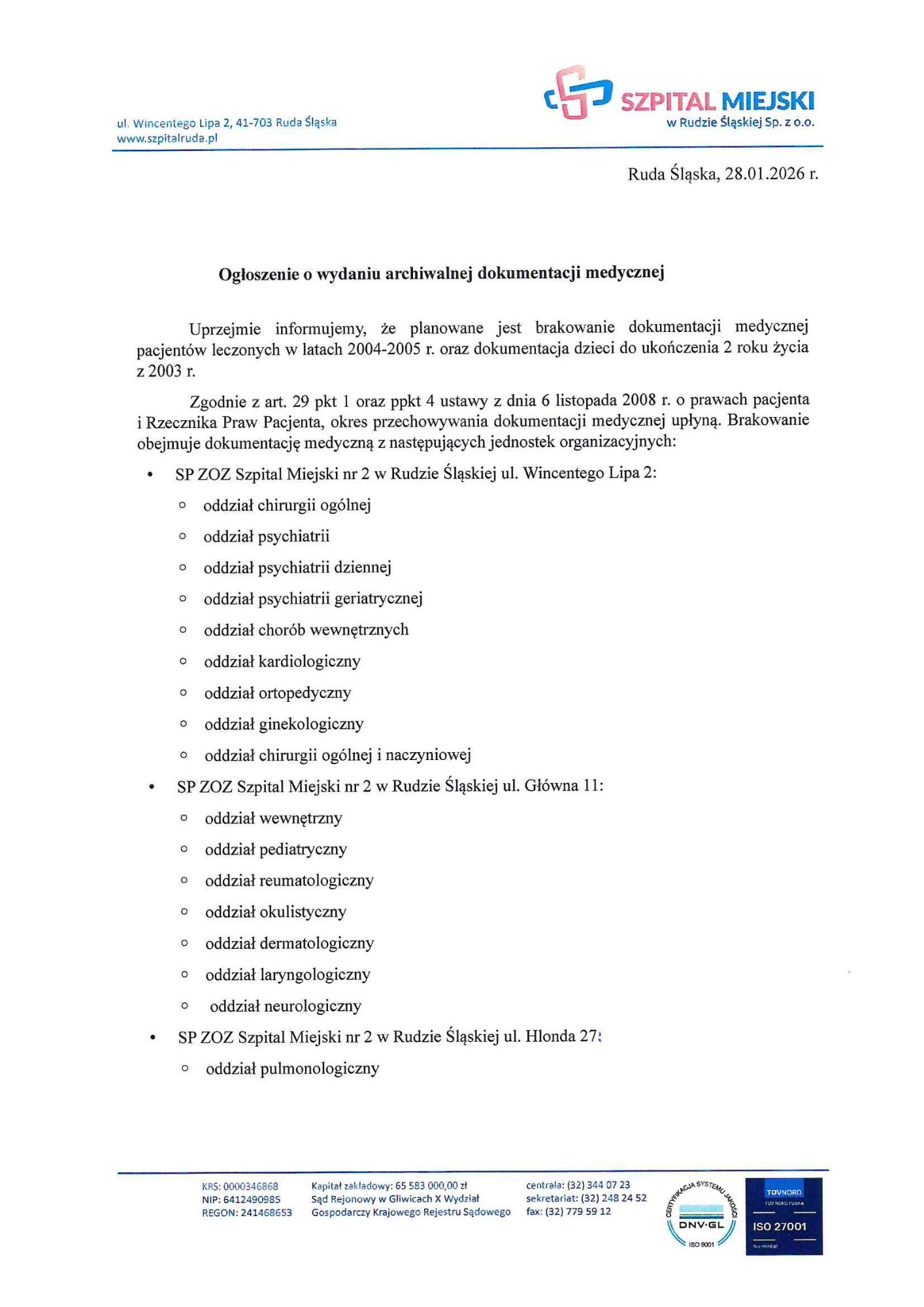 Rejestracja odbywa się jedynie telefonicznie pod numerem tel. 32/7795997 (Dział Rozliczeń Usług Medycznych i Statystyki Medycznej) od poniedziałku do piątku w godzinach 8:00-14:00