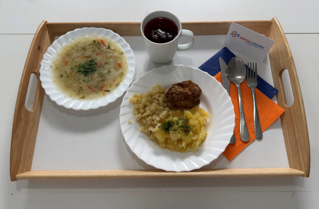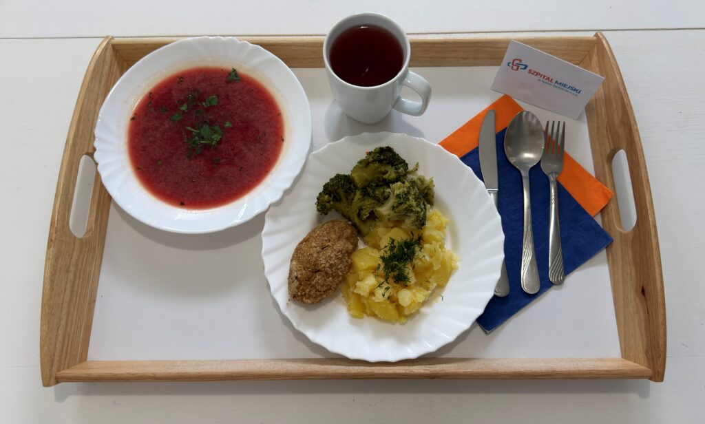 zupa barszcz czerwony z ziemniakami (MLE,JAJ,GLU,GOR,SEL,SOJ,SEZ) kotlet jajeczny 100g (JAJ,MLE,GLU,GOR,SEL,SOJ) ziemniaki gotowane 300g (MLE) brokuły parowane 120g (MLE,JAJ,GLU,GOR,SEL) kompot owocowy 250ml