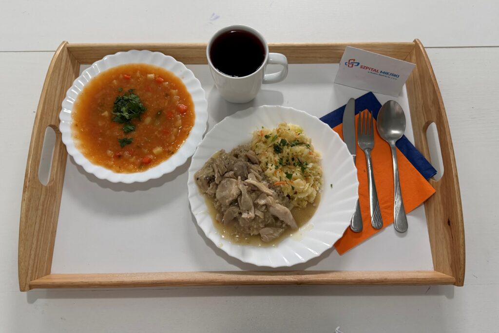 zupa jarzynowa z soczewicą z ziemniakami 350ml (MLE,GLU,JAJ,GOR,SEL,SOJ,SEZ) gulasz drobiowy 90g/60ml (GLU,MLE,ORZE,GOR,SEL,SEZ,SOJ) kasza jęczmienna gotowana 200g surówka colesław 120g (MLE,JAJ,GLU,GOR,SEL,ORZE,SOJ) kompot owocowy 250ml