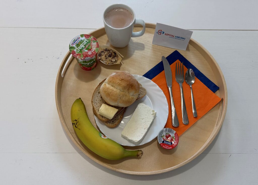 jogurt owocowy 150g (MLE) + musli 20g (GLU) kakao 250ml (MLE) chleb zwykły 50g (GLU,ŻYT) bułka kajzerka 50g (GLU,PSZ,ŻYT) masło 82% 20g (MLE) twaróg krajanka 50g (MLE,LAK) dżem 1szt/25g banan 200g