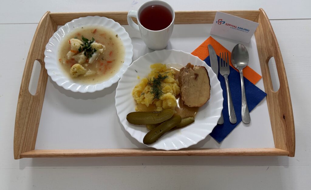 zupa kalafiorowa z grysikiem (MLE,JAJ,GLU,GOR,SEL,SOJ,SEZ,ORZ) szynka – sztuka mięsa wieprzowa duszona 100g (JAJ,MLE,GLU,GOR,SEL,SOJ,SEZ) sos pieczeniowy jasny 60ml( GLU,ORZE,GOR,SEZ) ziemniaki gotowane 300g (MLE) ogórek kiszony 120g (MLE,JAJ,GLU,GOR,SEL) kompot owocowy 250ml