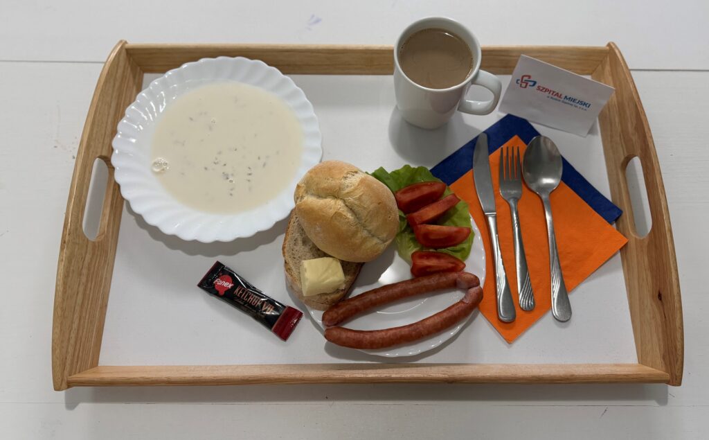 zupa mleczna z płatkami jęczmiennymi 300ml (MLE,GLU) kawa zbożowa 250ml (MLE,GLU,ŁUB) chleb zwykły 50g (GLU,ŻYT) bułka kajzerka 50g (GLU,PSZ,ŻYT) masło 82% 20g (MLE) kiełbaski frankfurterki 80g (MWP,GLU,GOR,SEL,SOJ) ketchup 17g/1szt (GOR,SEL) sałata zielona 10g pomidor 50g