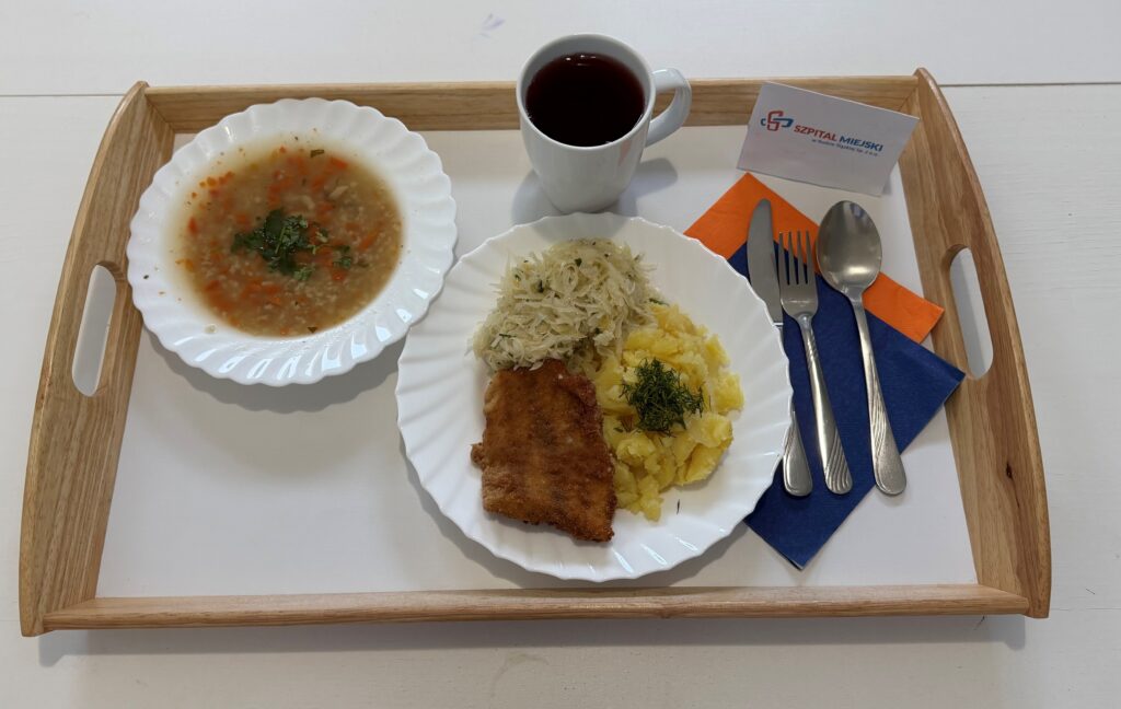 zupa krupnik z kaszą jęczmienną 350ml (GLU,MLE,JAJ,GOR,SEL,SOJ,SEZ,ORZ) morszczuk panierowany z pieca 100g (RYB,JAJ,GLU,GOR,SEL,SEZ,SOJ) ziemniaki gotowane 300g surówka z kiszonej kapusty 120g (ORZE,GOR,SEL,SEZ,SOJ) kompot owocowy 250ml