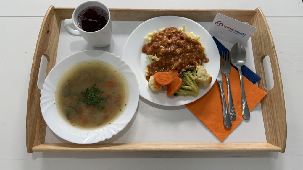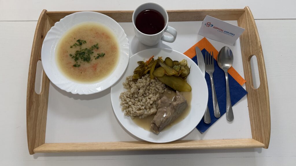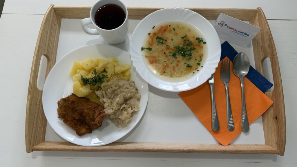 Obiad Dieta Podstawowa – 10.02.2026 zupa szpinakowa z ryżem 350ml (MLE,JAJ,GLU,GOR,SEL,SOJ,SEZ) kotlet mielony wieprzowy z pieca 100g (MLE,JAJ,GLU,GOR,SEL,SOJ,SEZ) ziemniaki gotowane 300g buraki gotowane 120g (SEL,GOR) kompot owocowy 250ml