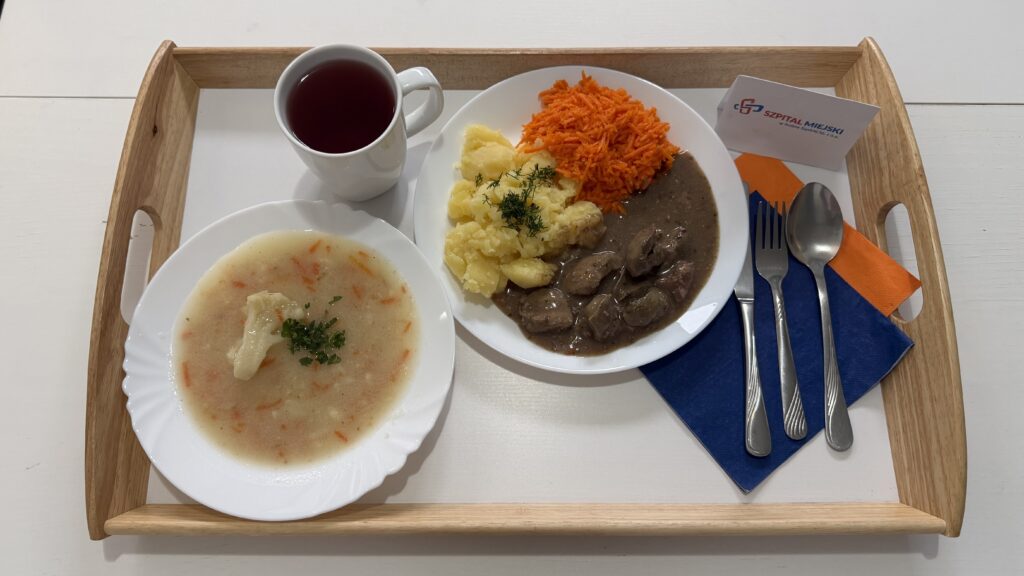 zupa kalafiorowa z kaszą manną 350ml (SEL,SOJ,GOR,GLU,SEZ) wątróbka duszona w sosie własnym 180g (GLU,ORZ,SEZ,GOR) ziemniaki gotowane 300g surówka z marchewki 120g (MLE,SEL,SOJ,ORZE,GOR,GLU) kompot owocowy 250ml