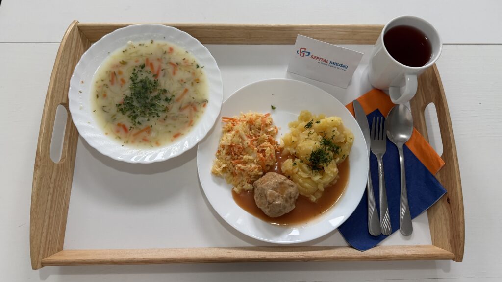zupa ogórkowa z ryżem 350ml (SEL,SOJ,GOR, ORZE,GLU,MLE) pulpet drobiowy 100g (JAJ,GLU,GOR,SEL,SOJ,SEZ) sos pomidorowy 60ml (MLE,GLU,ORZE,GOR,SEZ) ziemniaki gotowane 300g surówka colesław 120g (MLE,SEL,GOR,SEZ,SOJ) kompot owocowy 250ml