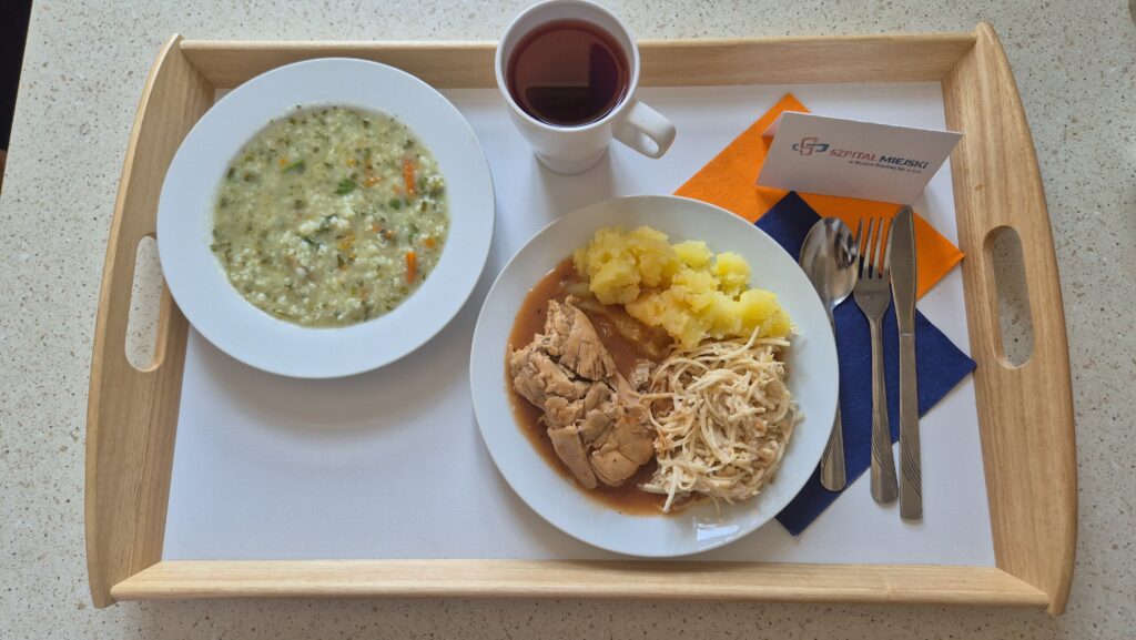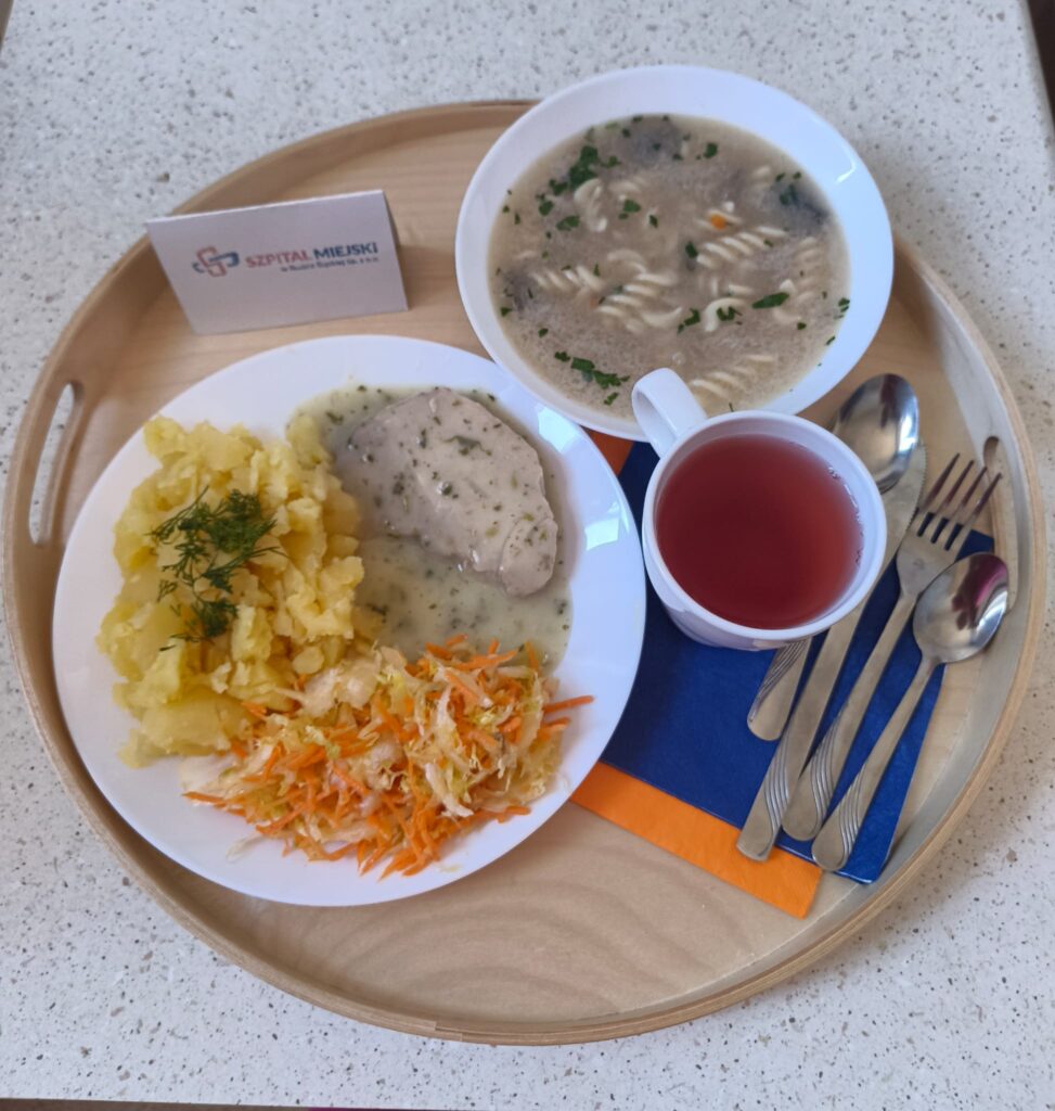 zupa pieczarkowa z makaronem 350ml (SEL,SOJ,GOR,GLU,MLE) sztuka mięsa wieprzowa duszona 100g (MWP) sos pieczeniowy jasny 60ml (MLE,GLU,ORZE,SOJ,GOR,SEZ) ziemniaki gotowane 300g surówka z kapusty pekińskiej z marchewką 120g (SOJ,GOR,SEZ,SEL) kompot owocowy 250ml
