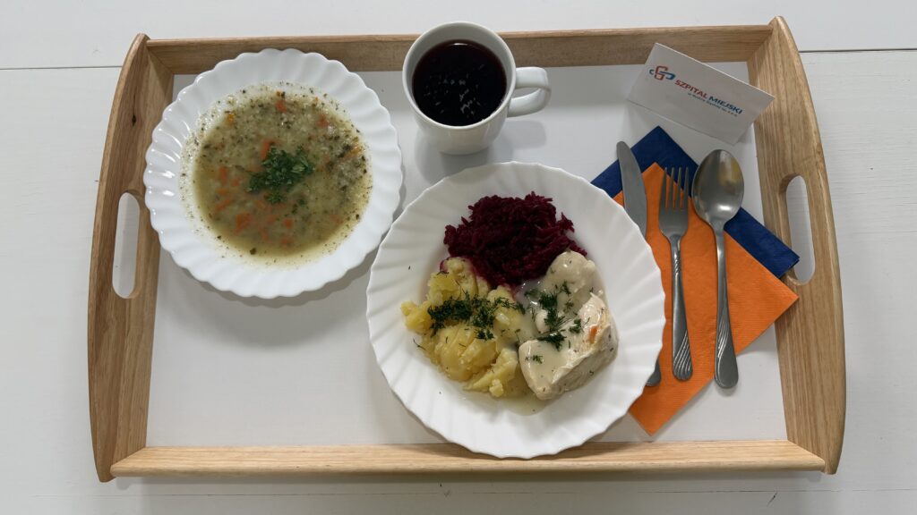 zupa szpinakowa z ryżem 350ml (JAJ,GLU,GOR,SEL,SOJ,SEZ,MLE) pierś z kurczaka pieczona 100g (MLE,GLU,GOR,SEL,SOJ) sos pietruszkowy 60ml (MLE,GLU,ORZ,SOJ,GOR,SEZ) ziemniaki gotowane 300g buraki gotowane 120g (SEL,MLE,GLU,SEZ) kompot owocowy 250ml
