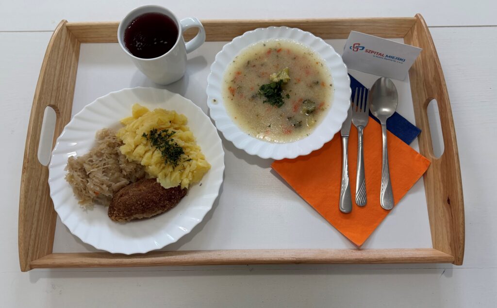 zupa brokułowa z kasza manną 350ml (GLU,MLE,JAJ,GOR,SEL,SOJ,SEZ) kotlet rybny z łososia z pieca 100g (MLE,RYB,GLU,JAJ,GOR,SEL,SEZ,SOJ) ziemniaki gotowane 300g kapusta kiszona gotowana 120g (MLE,GLU,JAJ,ORZE,GOR,SEL,SEZ,SOJ) kompot owocowy 250ml